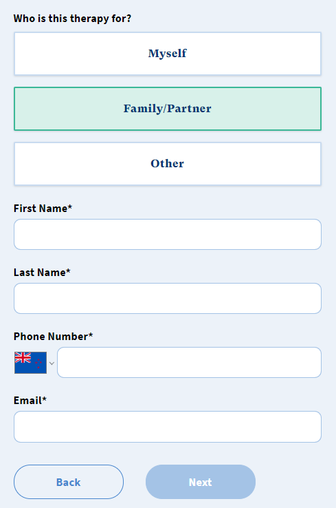 3. When asked Who is this therapy for?, select Family/Partner and enter the contact details of the person you are referring.